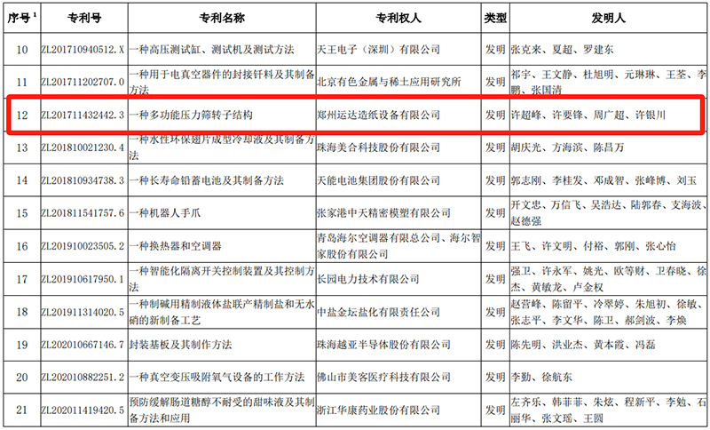 2023年11月15日,中國輕工業(yè)企業(yè)管理協(xié)會對2023 年度輕工業(yè)專利成果評價,鄭州運達《一種多功能壓力篩轉(zhuǎn)子結(jié)構(gòu)》發(fā)明專利榮獲2023年度輕工業(yè)專利成果一等項目,這一榮譽是對運達創(chuàng)新實力的高度認可,也是對運達的產(chǎn)品在各企業(yè)應(yīng)用的卓越表現(xiàn)的肯定。在此,向所有支持和關(guān)注運達的朋友們表示衷心的感謝!