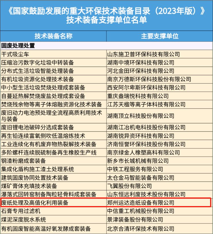 根據(jù)國(guó)家工業(yè)和信息化部發(fā)布的《關(guān)于征集2023年國(guó)家鼓勵(lì)發(fā)展的重大環(huán)保技術(shù)裝備的通知》(工信廳聯(lián)節(jié)函〔2023〕142號(hào))要求,經(jīng)省級(jí)有關(guān)主管部門及有關(guān)行業(yè)協(xié)會(huì)推薦、專家評(píng)審等,工業(yè)和信息化部、生態(tài)環(huán)境部共同組織編制了《國(guó)家鼓勵(lì)發(fā)展的重大環(huán)保技術(shù)裝備目錄(2023年版)》,公布鄭州運(yùn)達(dá)造紙?jiān)O(shè)備有限公司為“廢紙?zhí)幚砑案咧祷醚b備”技術(shù)裝備支撐單位。